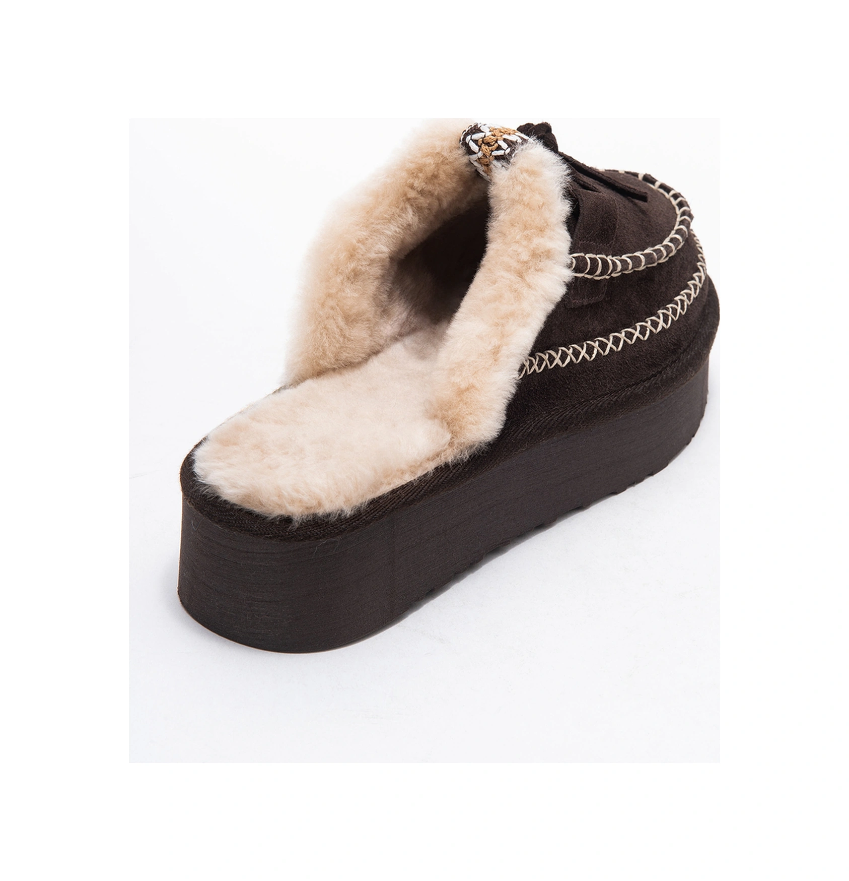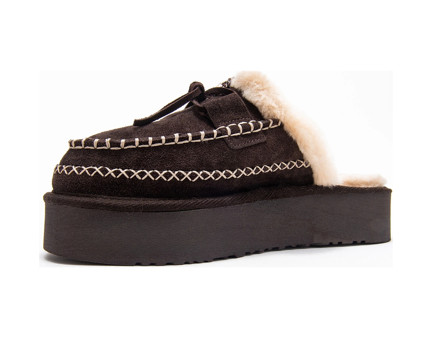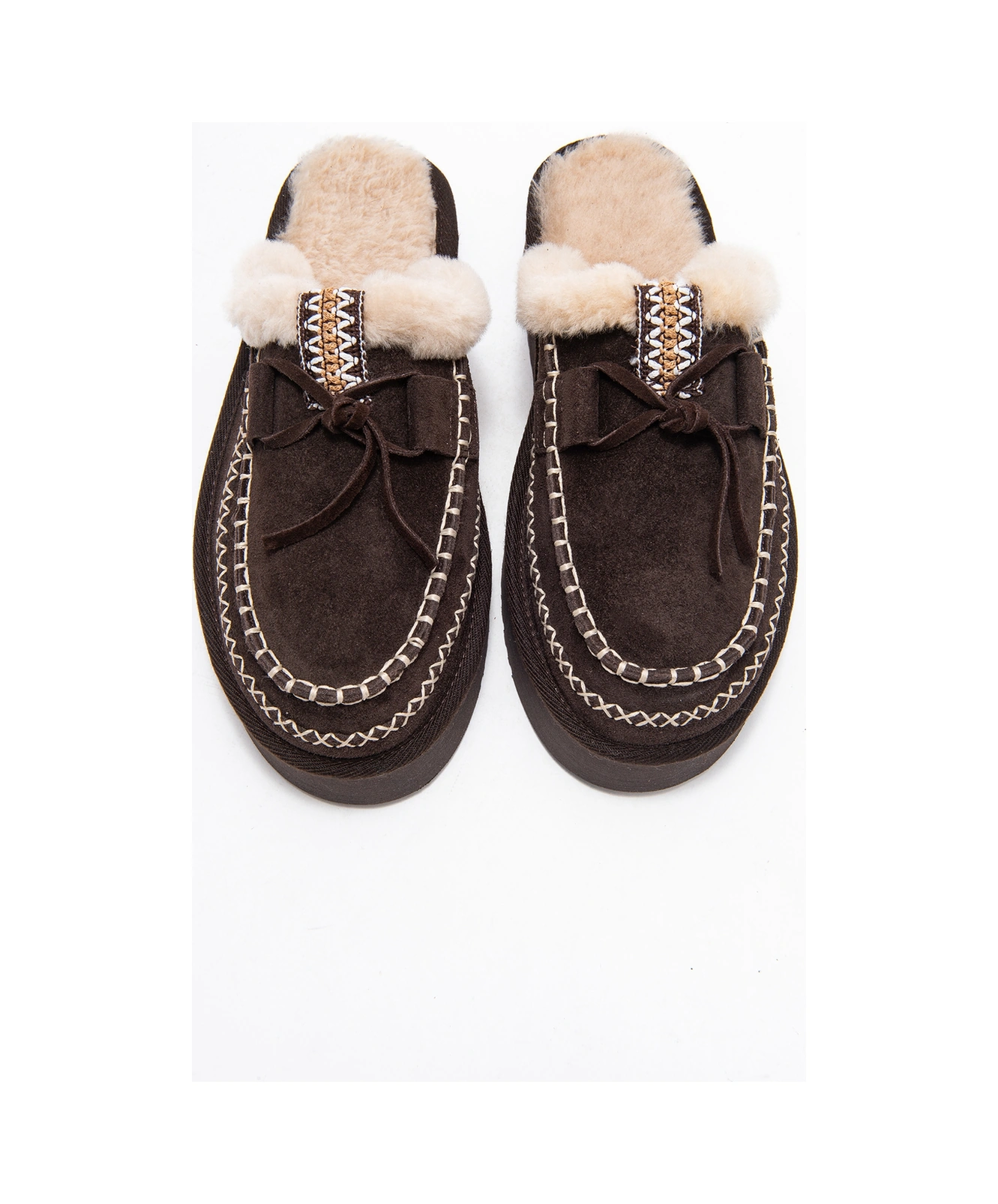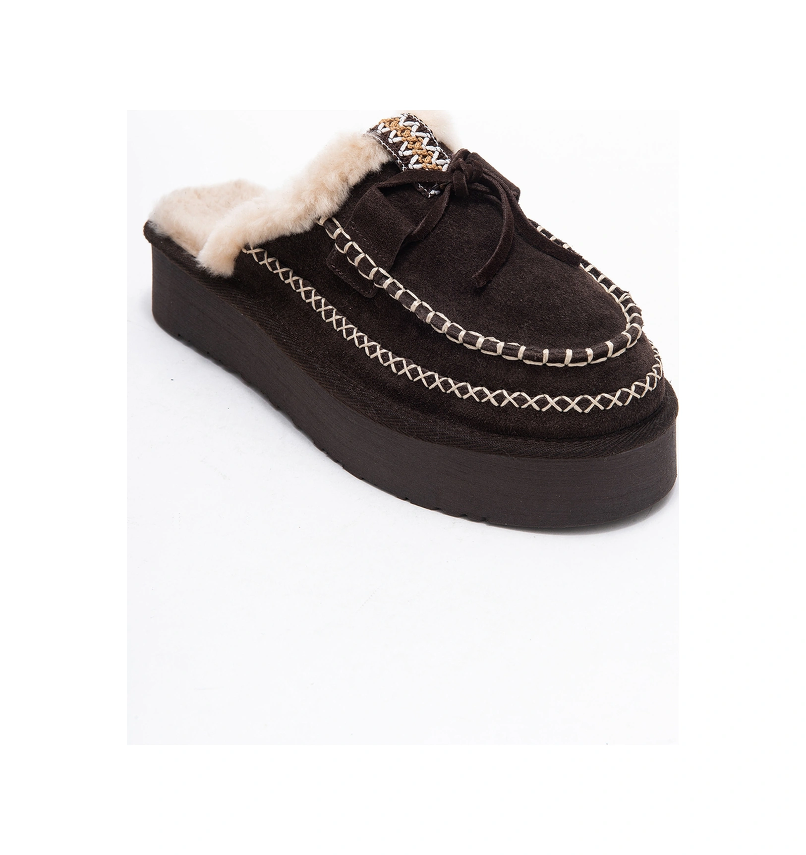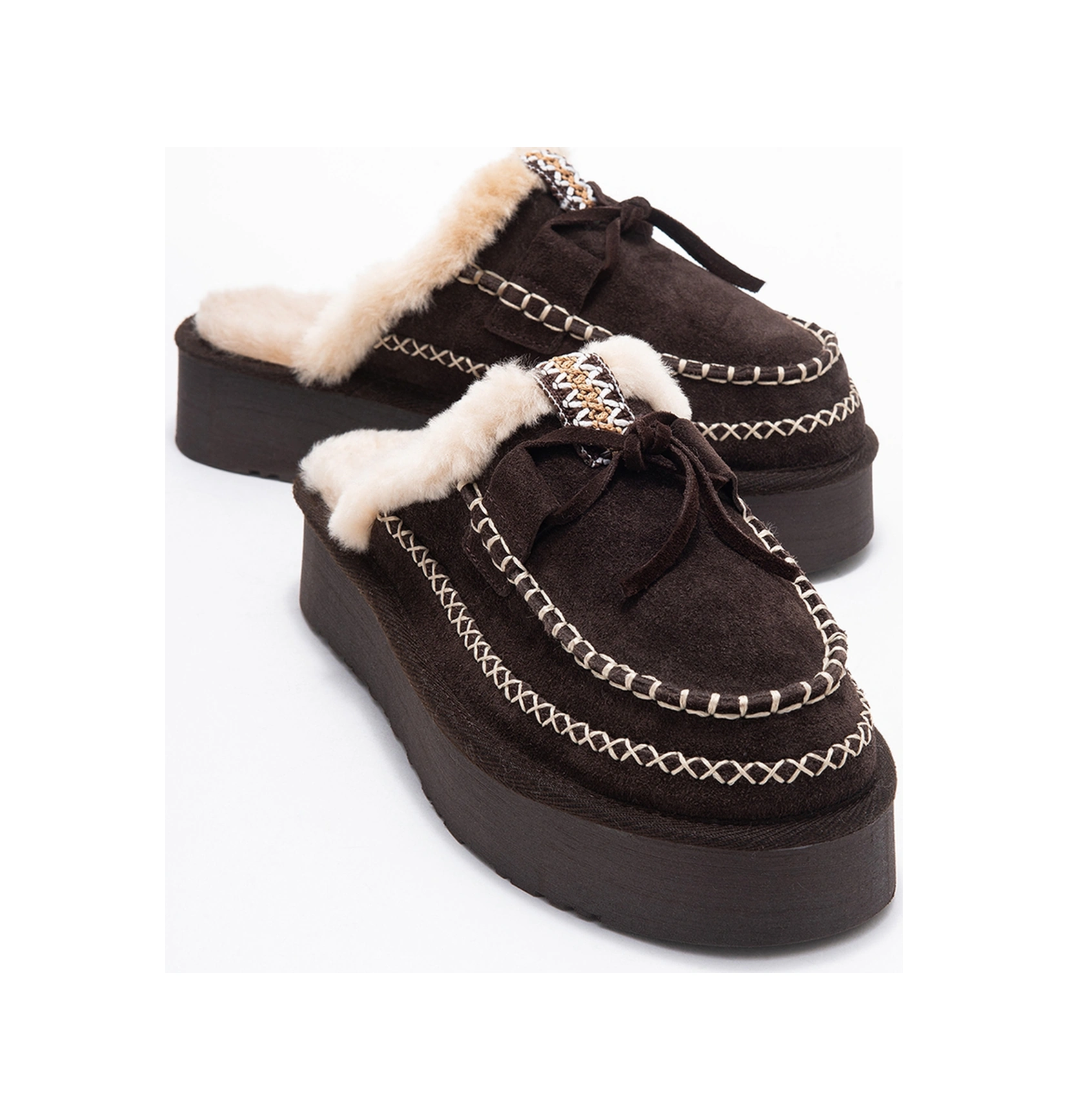 Yalına Kahverengi Süet Hakiki Deri Dikişli Kürklü Kadın Platform Tabanlı Makosen Terlik Kahverengi
