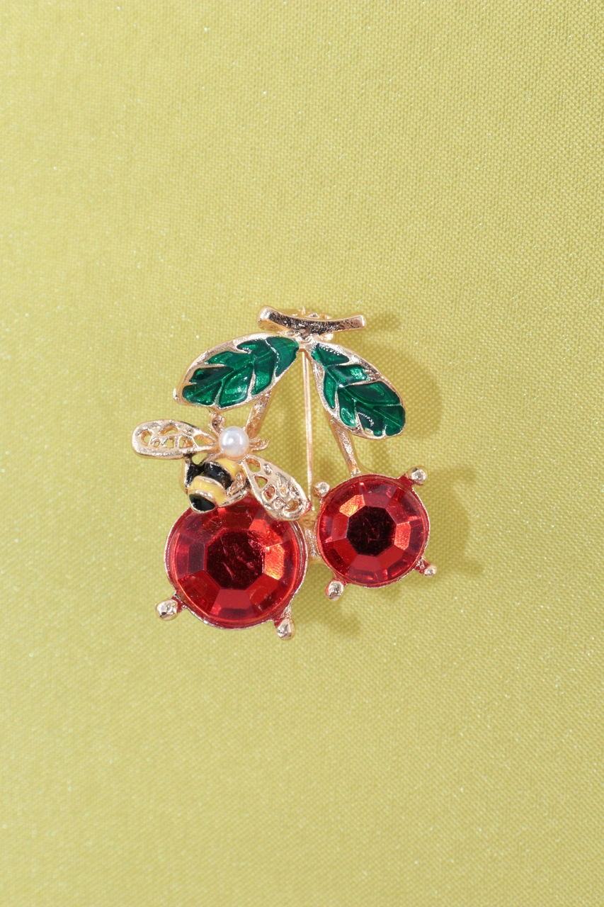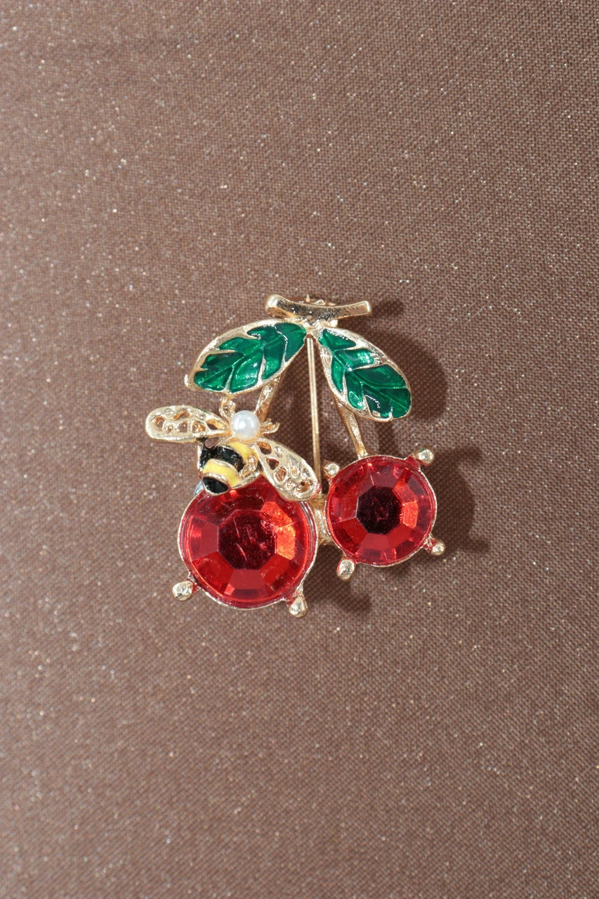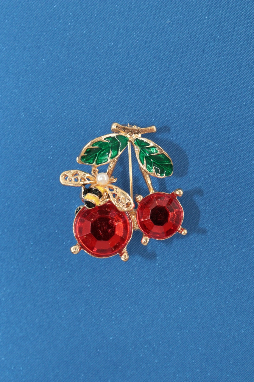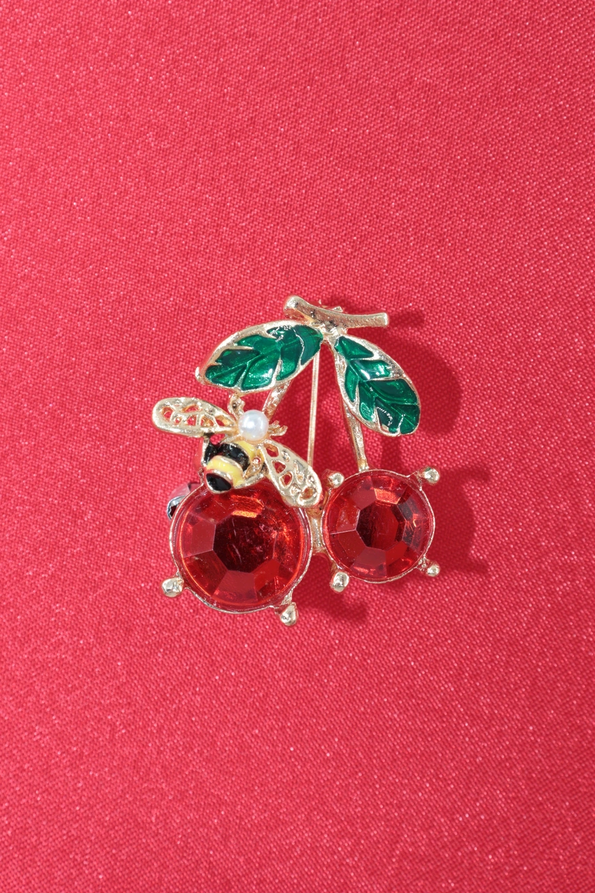 Yazın Neşesi Arılı Kiraz Broş. Altın Dallı Kristal Taşlı Yakut Renkli Kiraz Arı Kadın Yaka İğnesi Gold Kıımızı