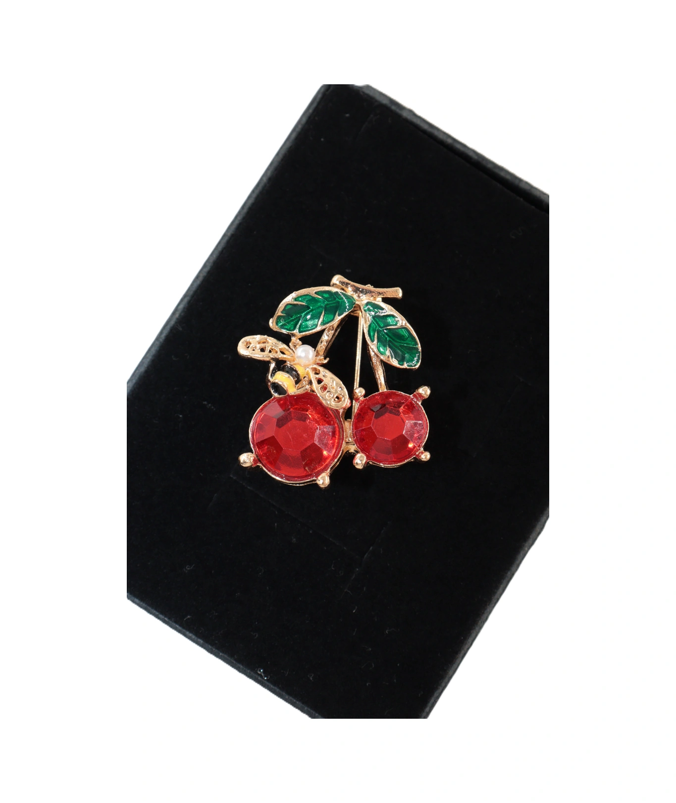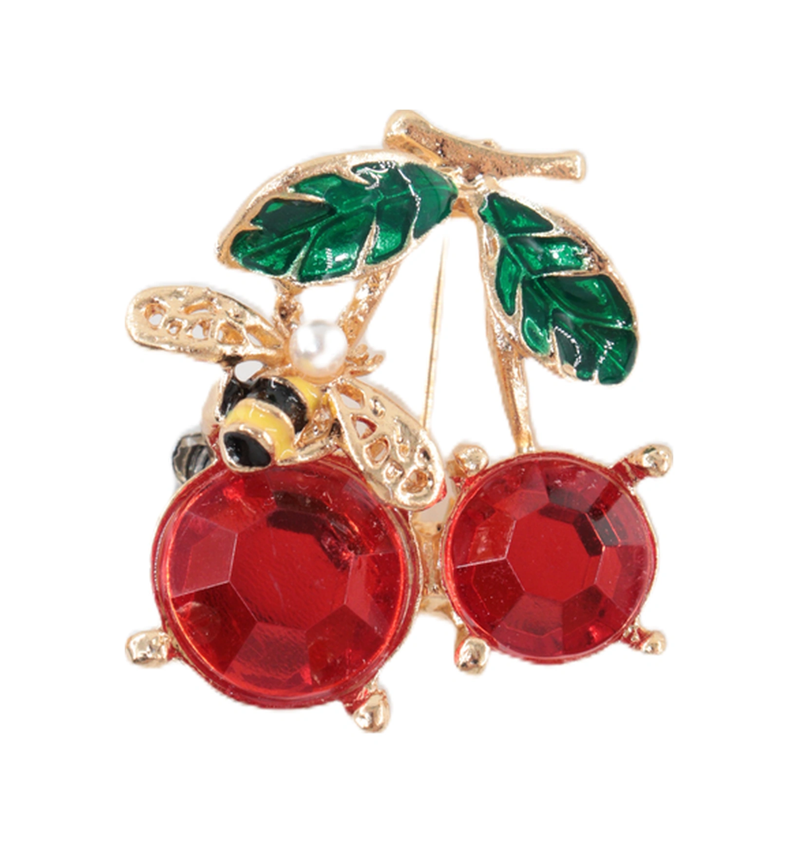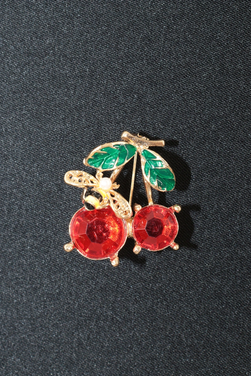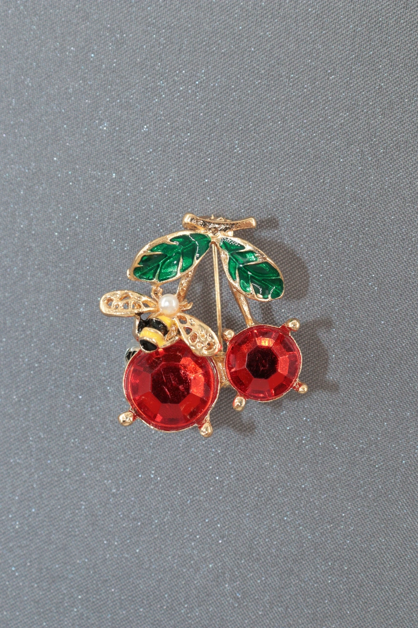 Yazın Neşesi Arılı Kiraz Broş. Altın Dallı Kristal Taşlı Yakut Renkli Kiraz Arı Kadın Yaka İğnesi Gold Kıımızı