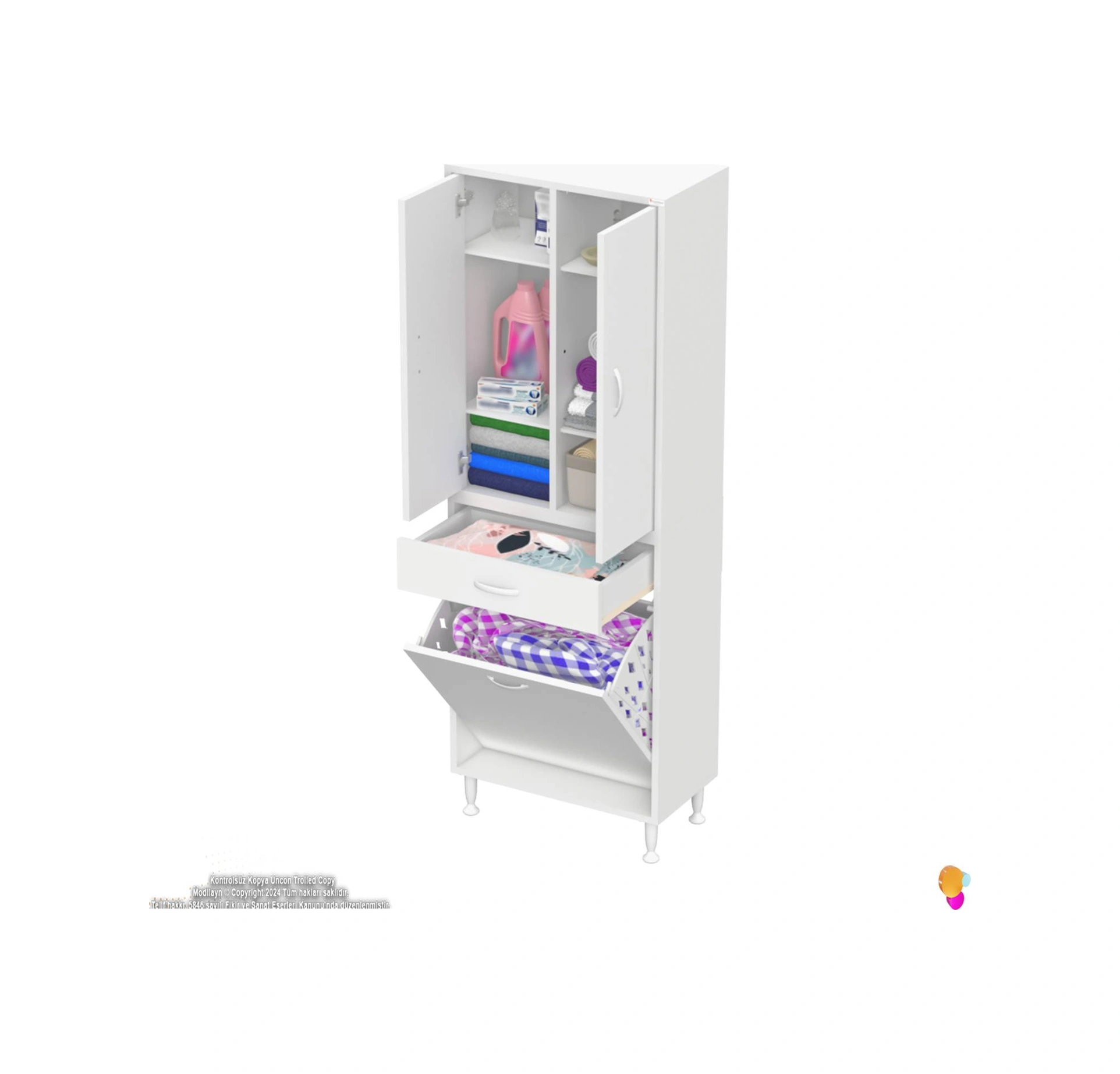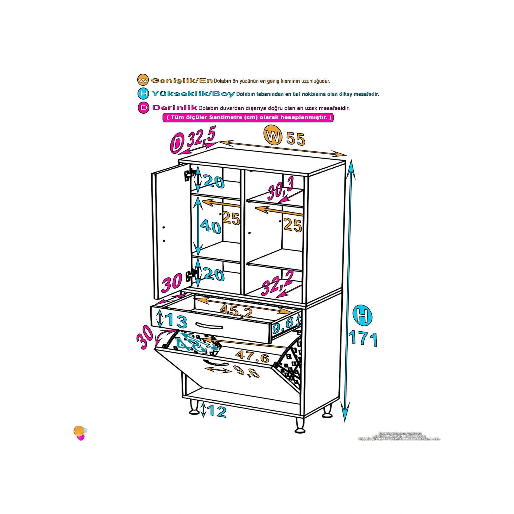 Yeni Kayra Tek Çekmece, 1 Göz Sepet, 2 Kapak, 6 Raf Dar Alan Banyo Dolabı 55x173x32,5 Cm Beyaz