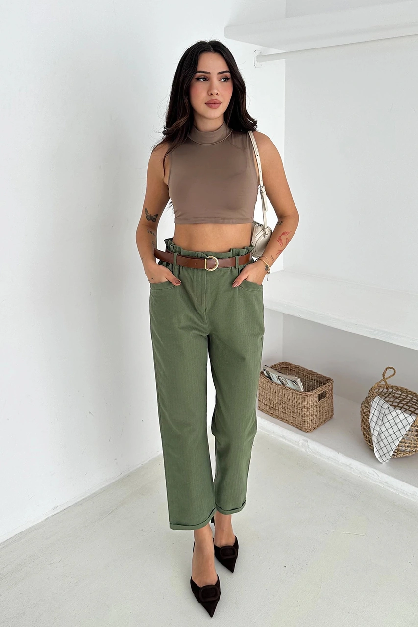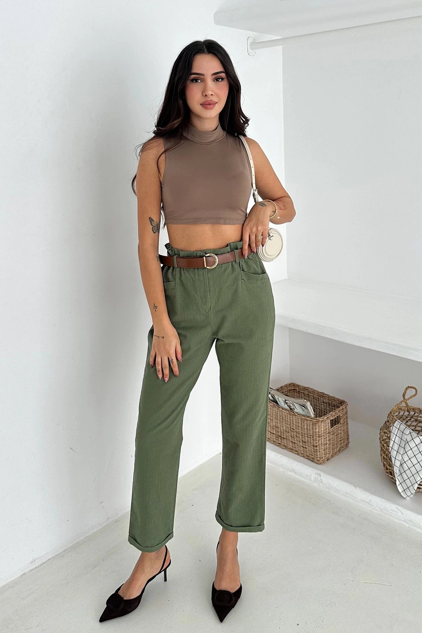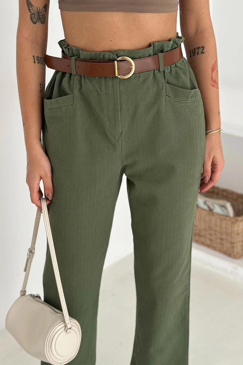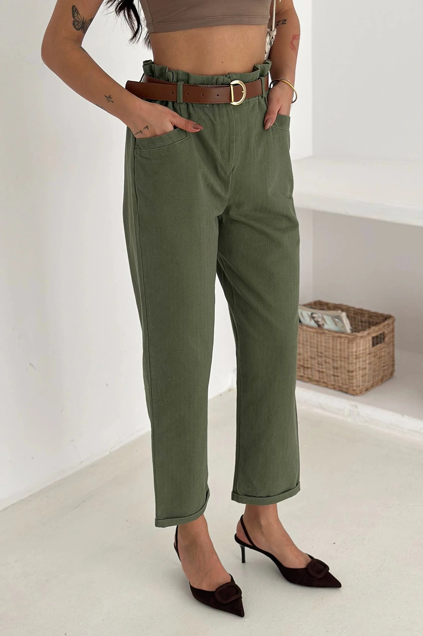 Yıkamalı Pamuk Yağmur Gabardin Yüksek Bel Pantolon Haki Haki