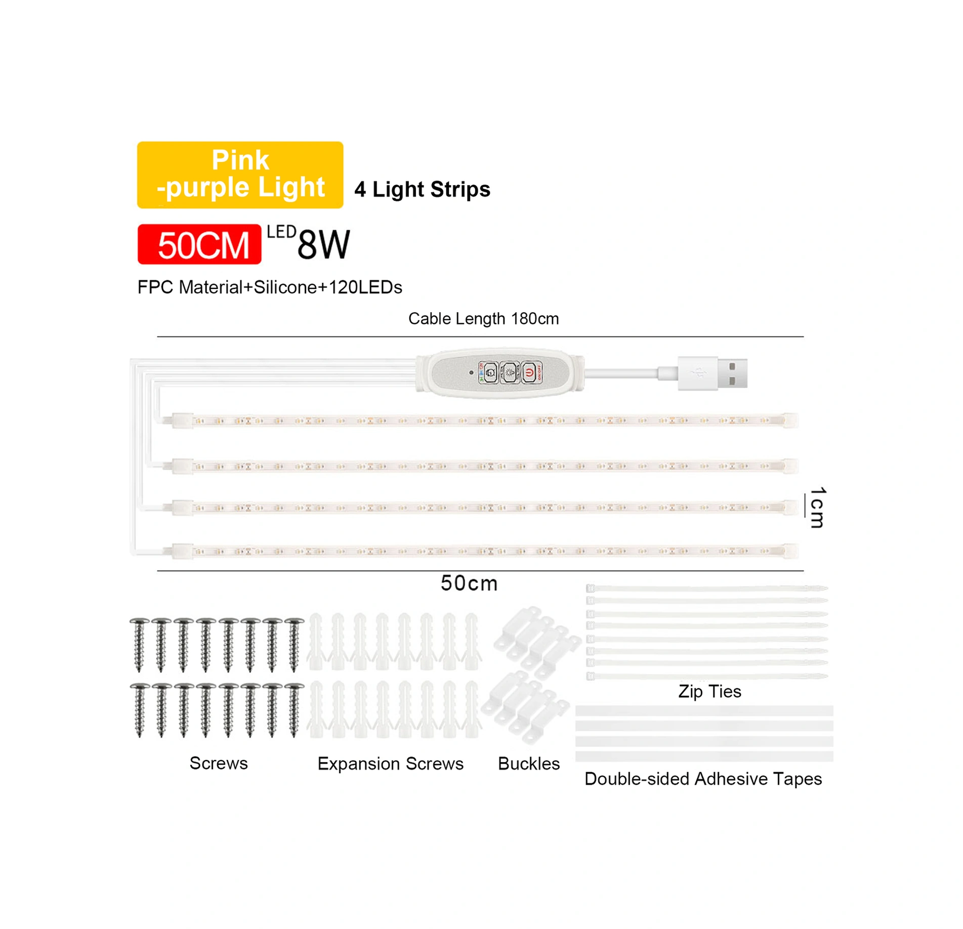 Youmex Bitkisel Büyüme Işığı 4 Şerit - Pembe-mor Spektrum, 4 Seviye Parlaklık, 3/9/12 Saat Zamanlayıcı, Usb Plug & Play, 50cm Uzunluk