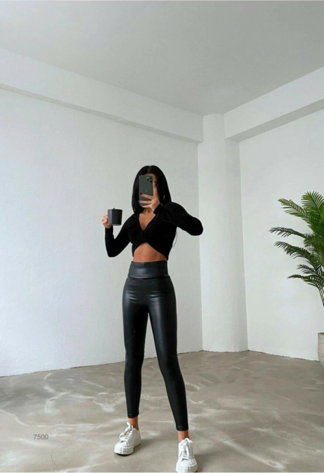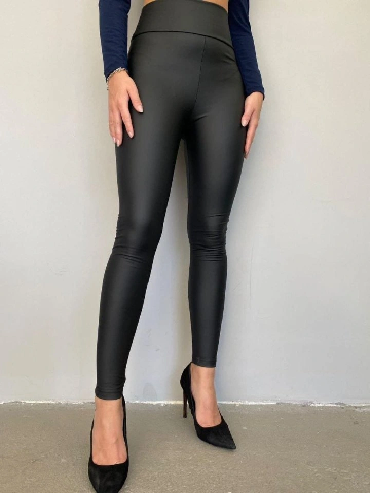 Yüksek Bel Toparlayıcı İçi Şardonlu Deri Tayt Siyah