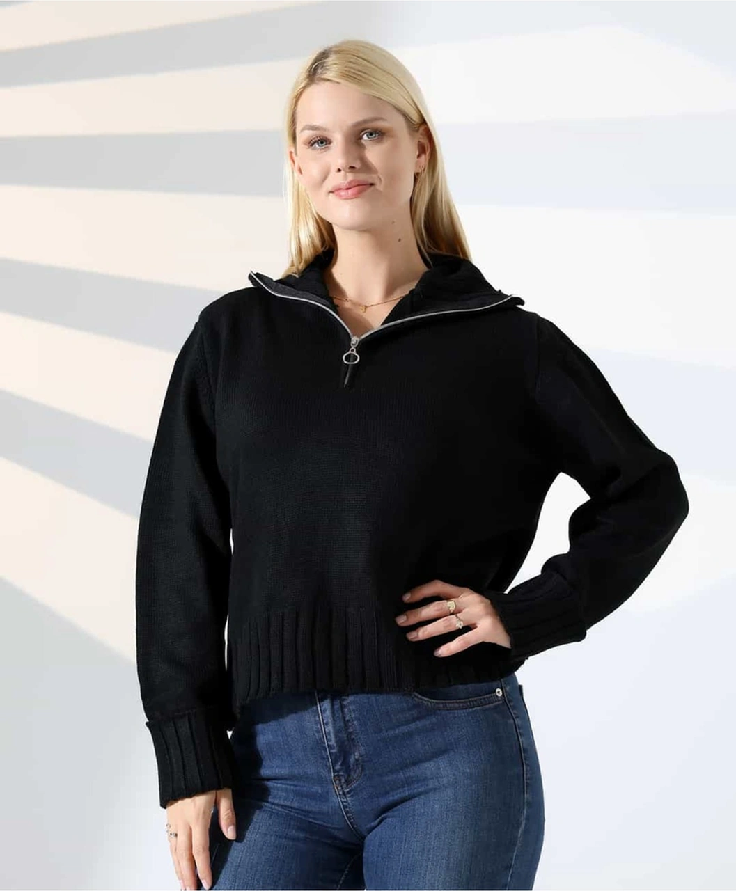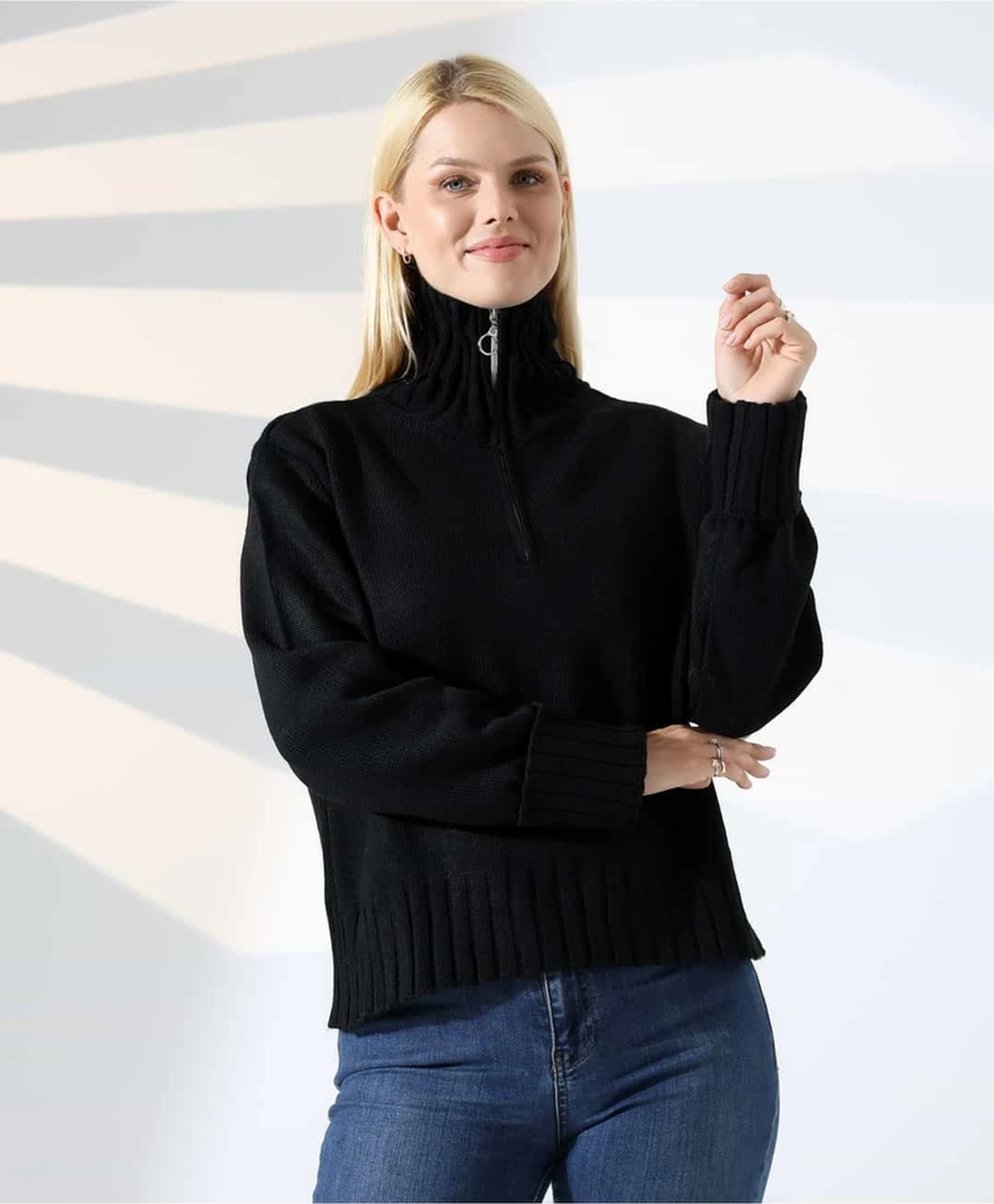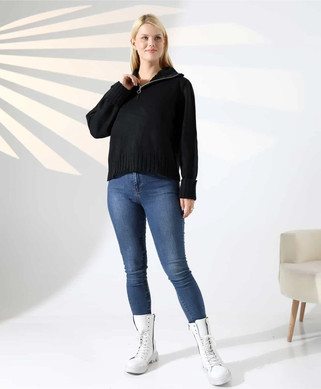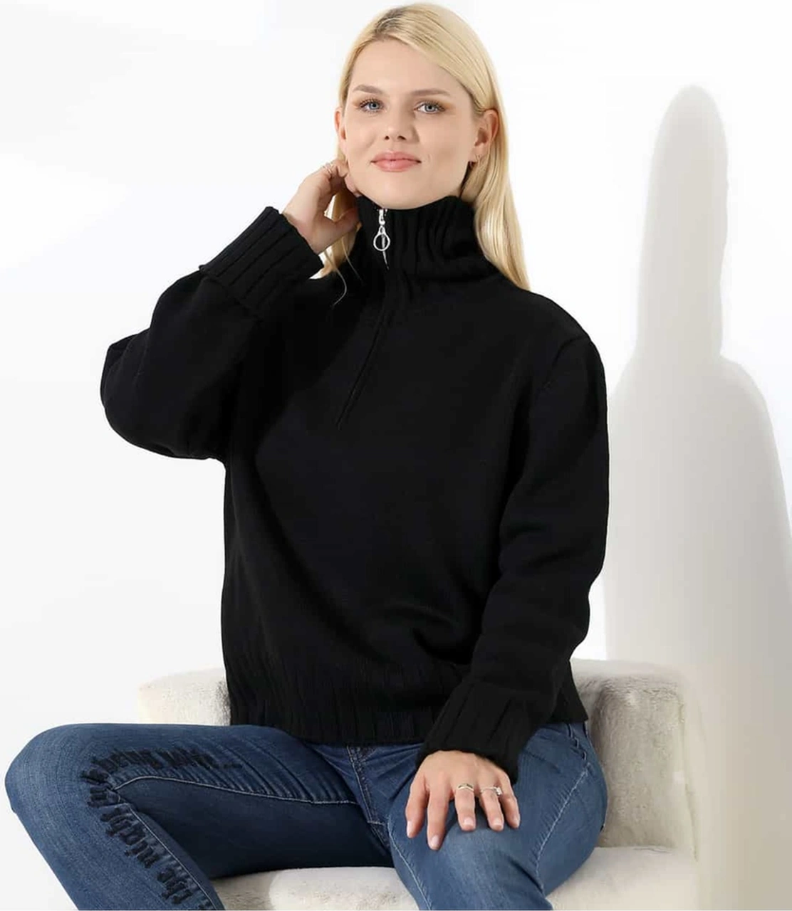 Yüksek Yaka Fermuarlı Triko Kazak Siyah