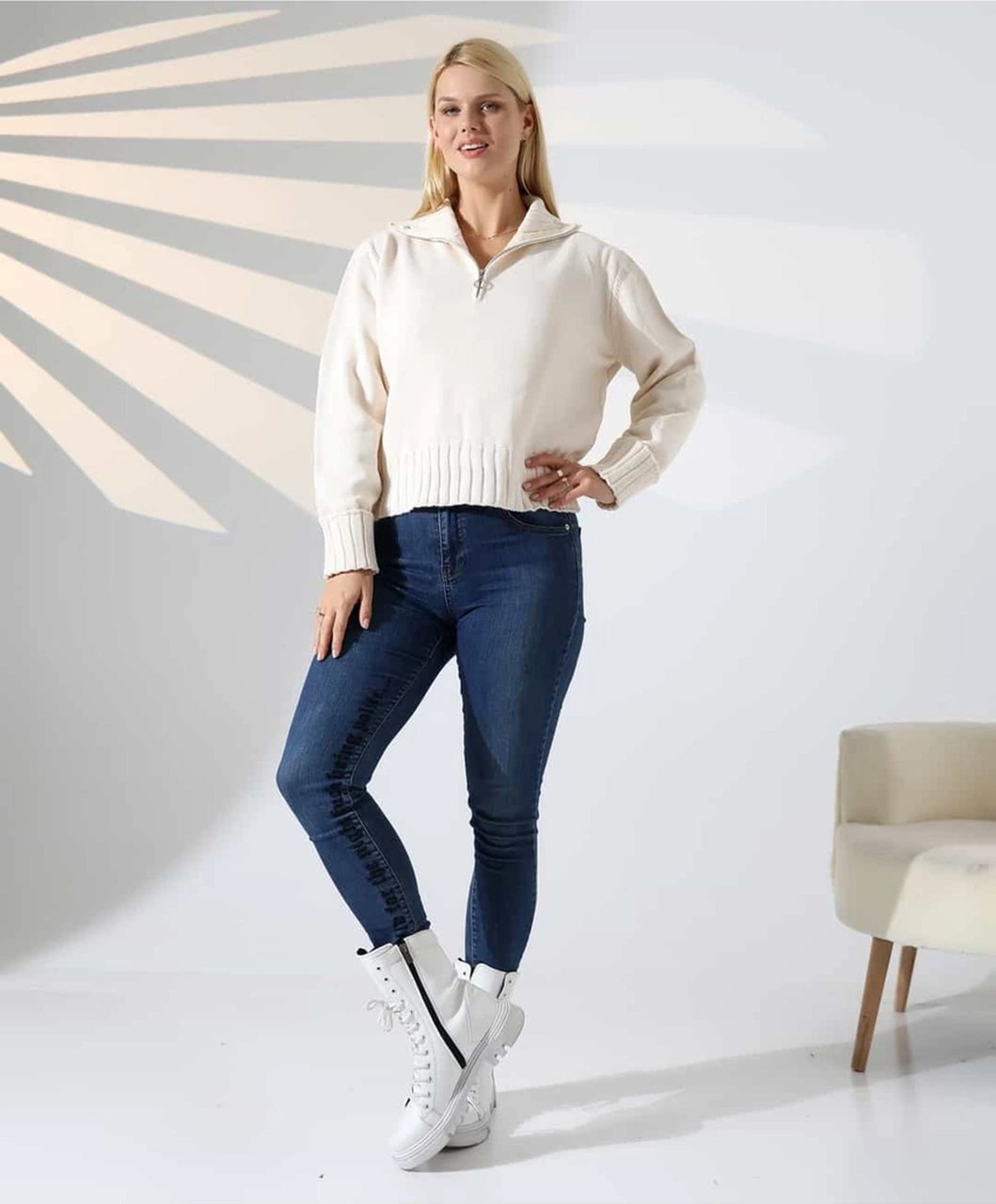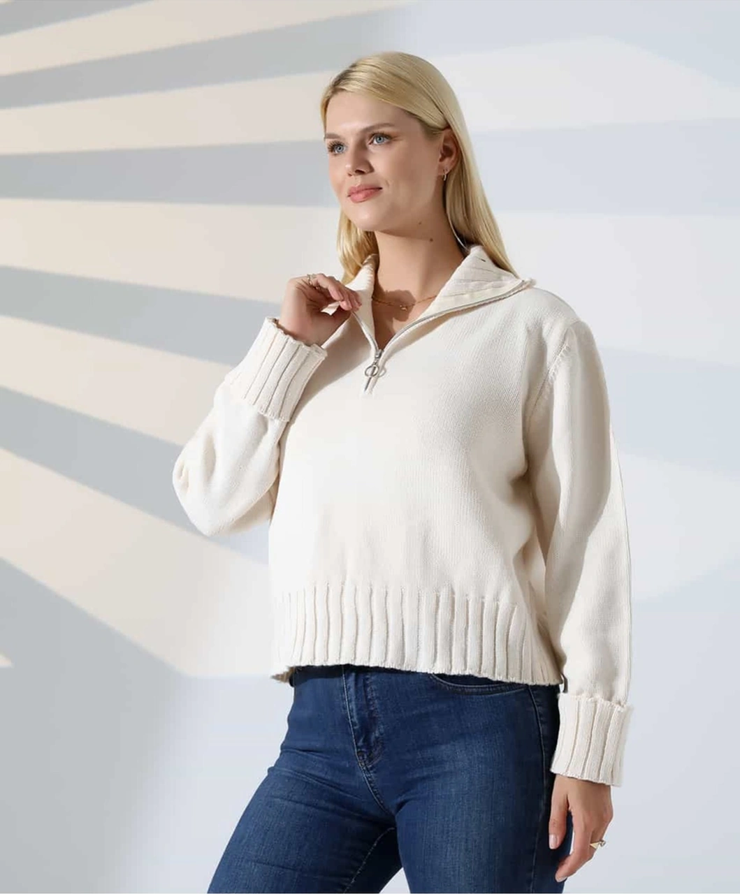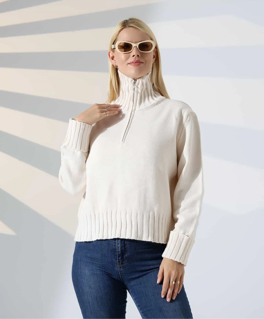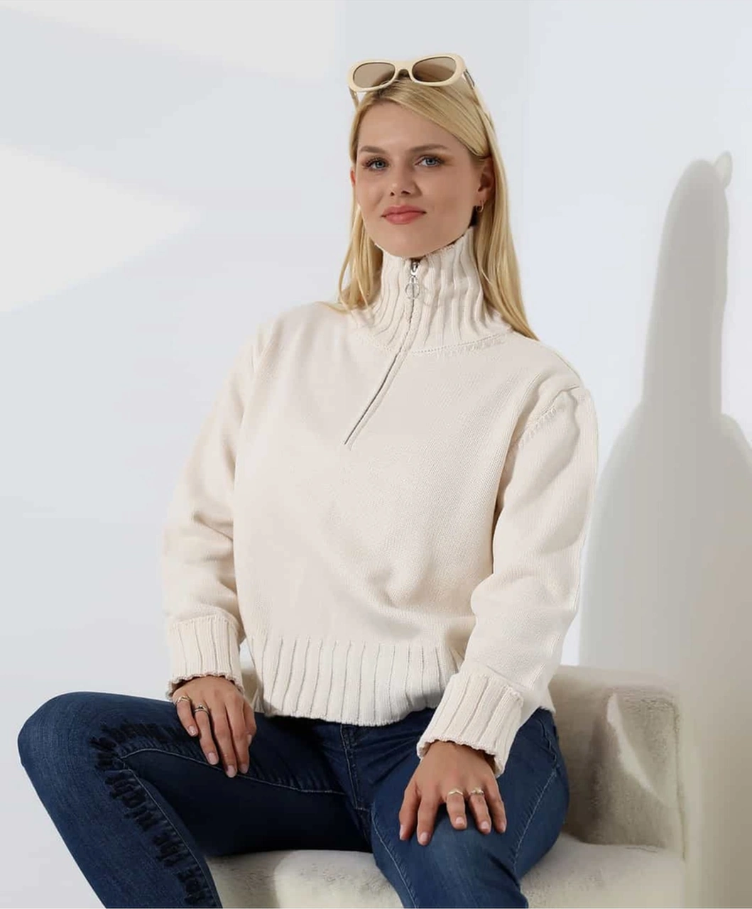 Yüksek Yaka Fermuarlı Triko Kazak Taş
