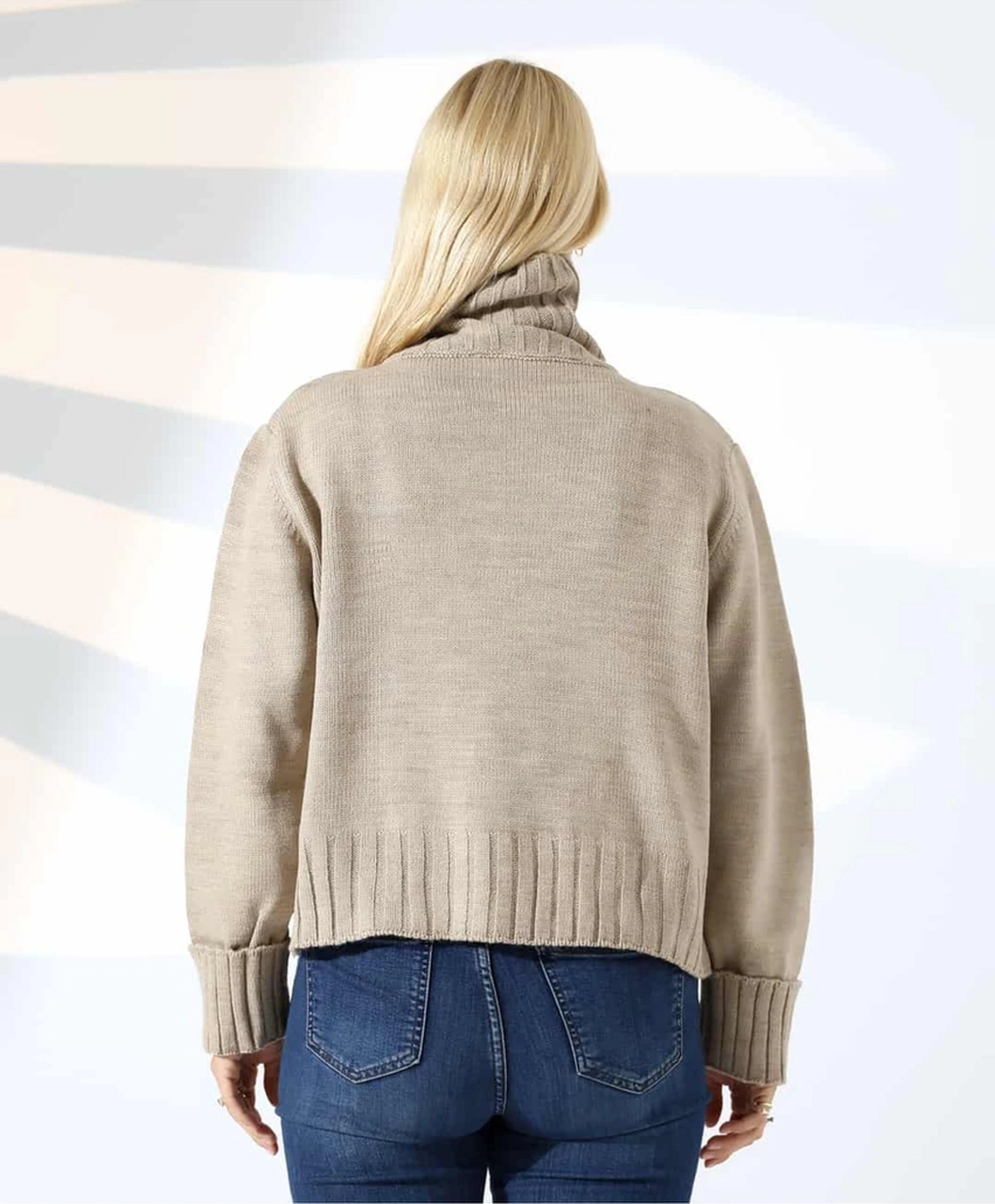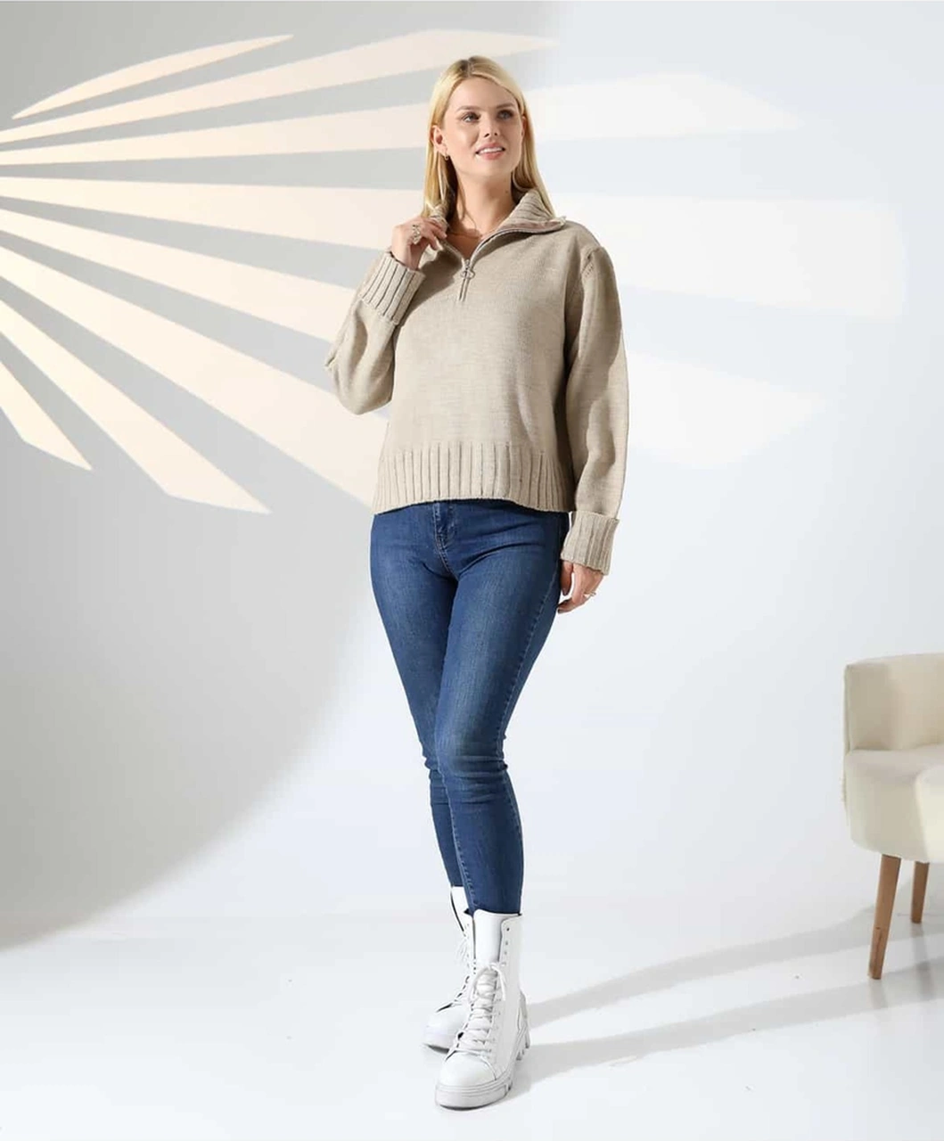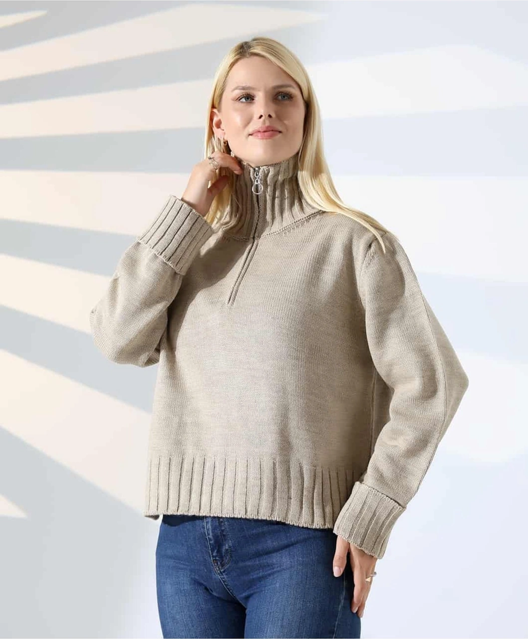 Yüksek Yaka Fermuarlı Triko Kazak Vizon