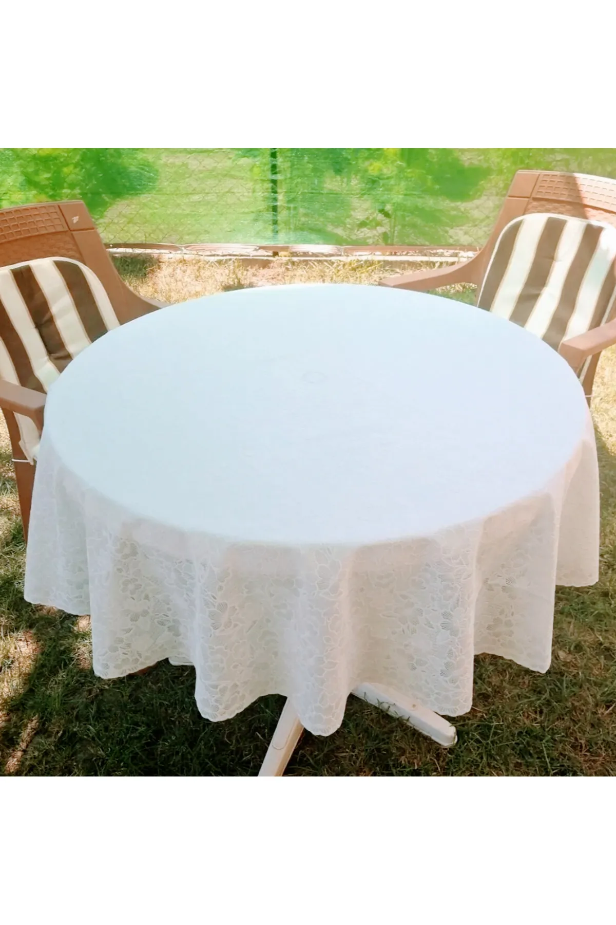 Yuvarlak Dantel Görünümlü Pvc Muşamba Mutfak Masa Örtüsü Sıvı Geçirmez Silinebilir /ebat: 150 Cm Beyaz