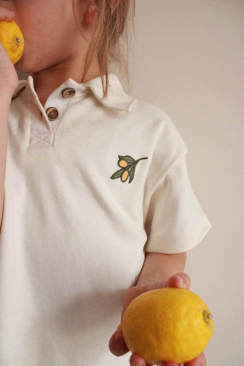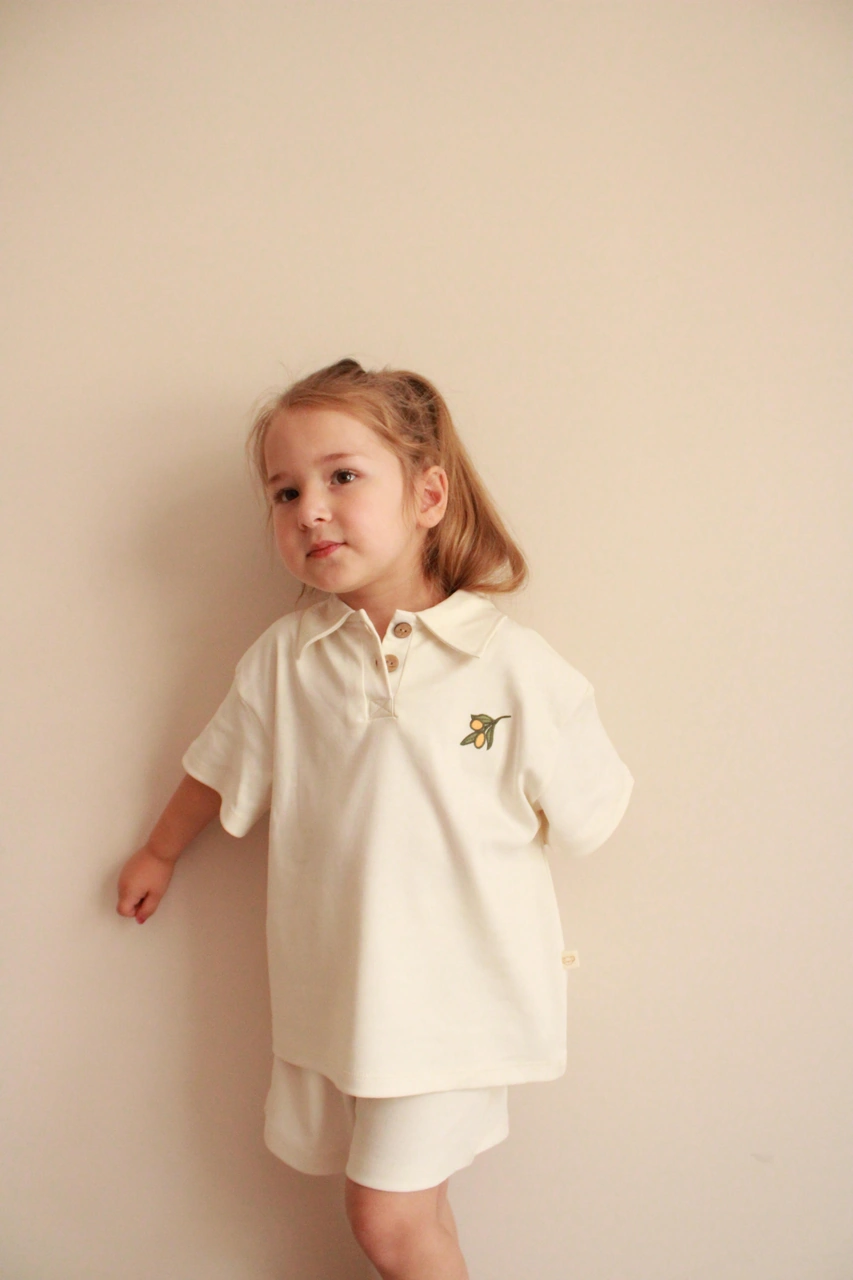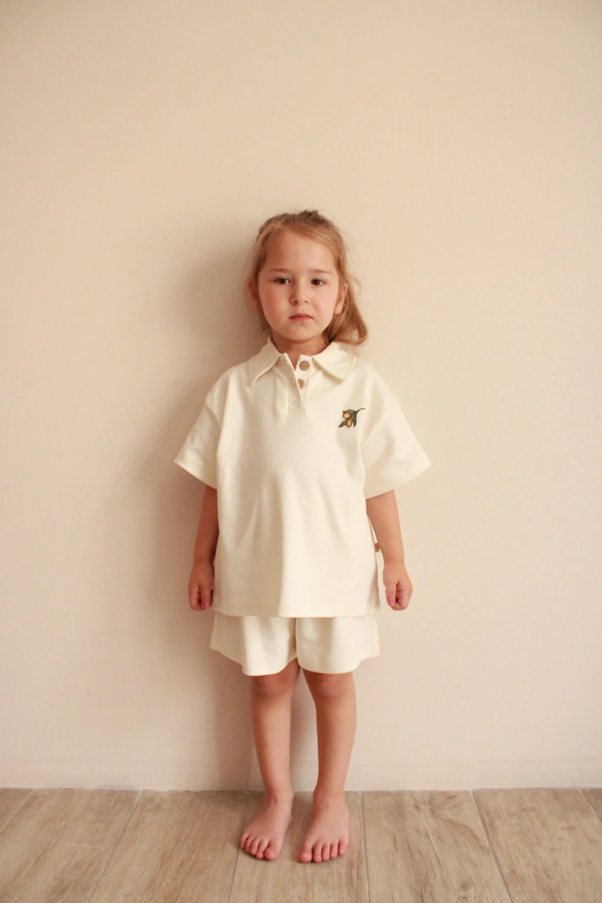 Zeytin Nakışlı Polo Yaka Şortlu Takım Ekru