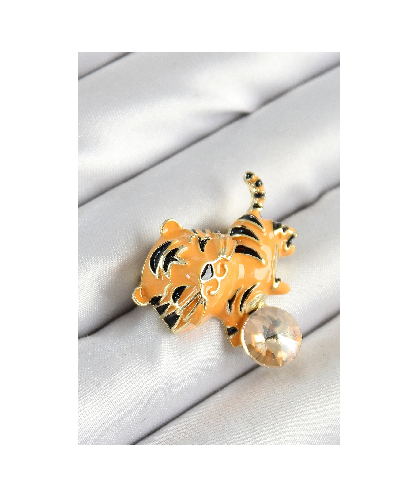Zirkon Taşlı Siyah Çizgili Turuncu Kaplan Figürlü Gold Renk Kadı Renkli